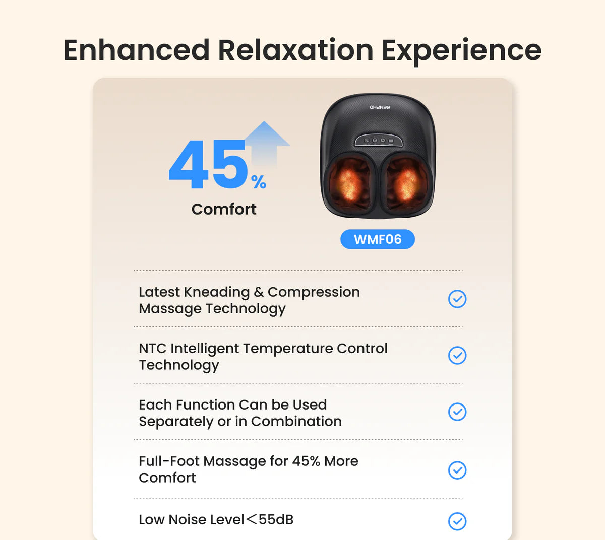 Full-foot massager delivers enhanced comfort through adjustable deep kneading, compression, and heat, thoroughly targeting the toes, plantar, arches, heels, insteps, and ankles.